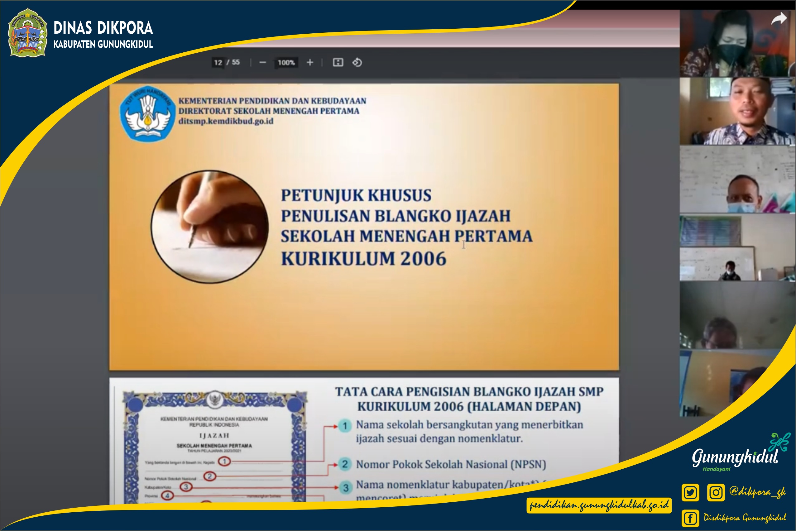 WONOSARI- Dinas Pendidikan, Pemuda, dan Olahraga (Disdikpora) Kabupaten Gunungkidul menyelenggarakan kegiatan Sosialisasi Penulisan Blanko Ijazah SMP Tahun Pelajaran 2020/2021. Kegiatan dilaksanakan secara daring dan disiarkan secara langsung melalui channel youtube Disdikpora Gunungkidul dengan link https://www.youtube.com/watch?v=b7fP5mEVpa0 . Kegiatan tersebut dihadiri oleh Wahyudi, M.Pd selaku Kepala Seksi Kurikulum dan Penilaian Sekolah Menengah Pertama Bidang Sekolah Menengah Pertama Dinas Pendidikan, Pemuda, dan Olahraga Kabupaten Gunungkidul dan diikuti oleh Kepala Sekolah SMP di Kabupaten Gunungkidul serta Koordinator Penulisi Ijazah tahun pelajaran 2020/2021.